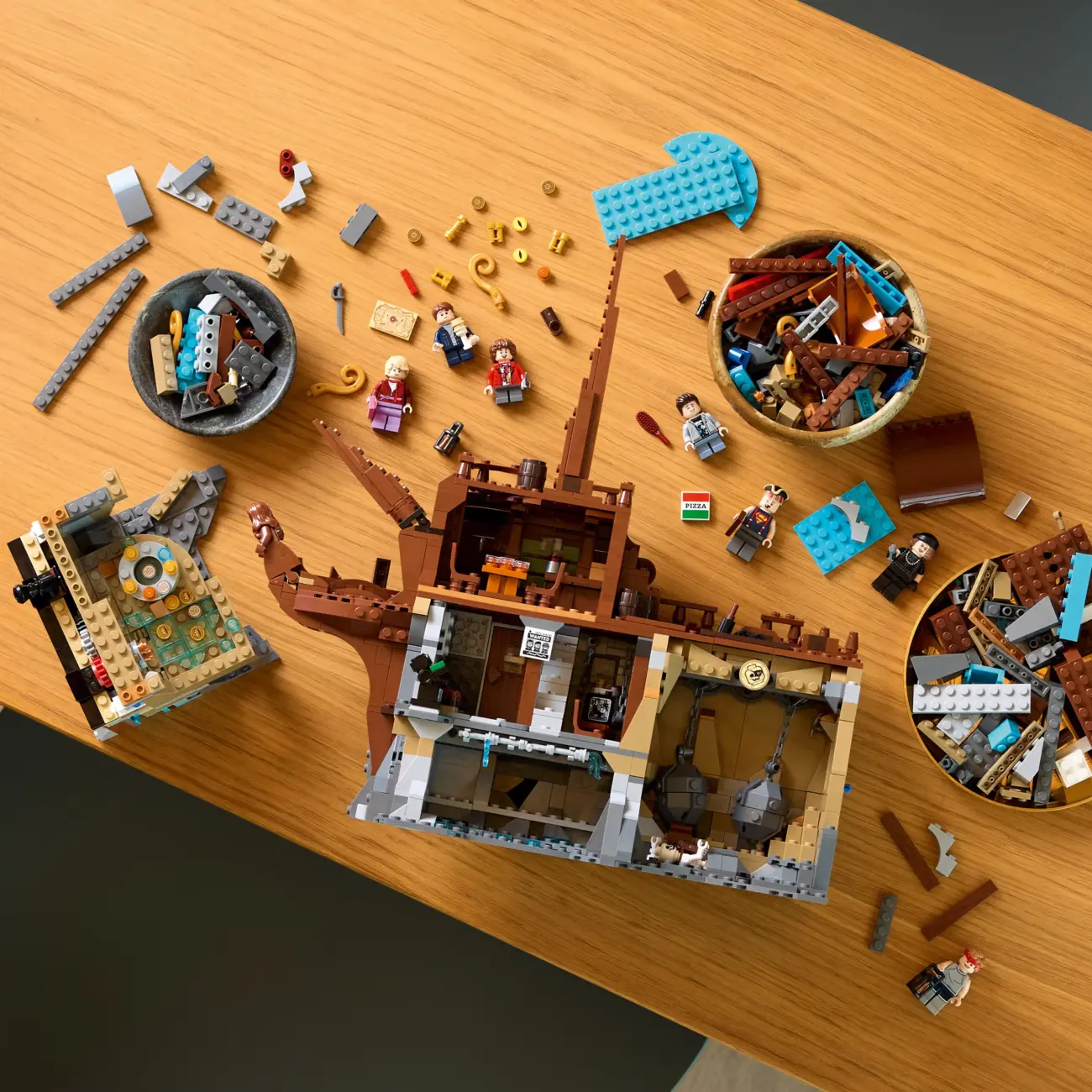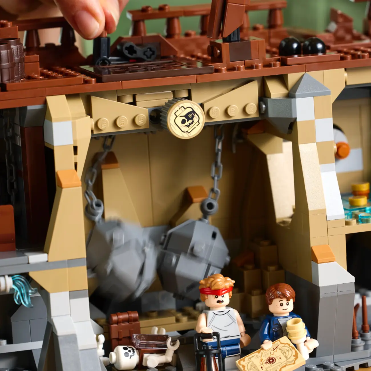Baumeister können mit dem Kupferknochen-Schlüsselskelett Felsbrocken fallen lassen und Falltüren auslösen oder die Skelett-Orgel spielen – aber Vorsicht, keine falsche Note treffen! Das Set steckt voller nostalgischer Details für Goonies-Fans, darunter Requisiten wie Datas Werkzeuggürtel und Mouths Haarbürste. Sogar die legendäre, herausgeschnittene Oktopus-Szene wird angedeutet, ebenso wie Sloths waghalsige Rutschpartie vom Mast auf das Deck der Inferno.