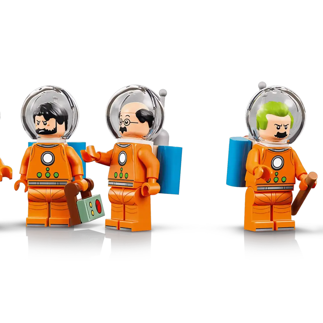 Das Set bringt sechs legendäre Figuren aus der Tintin-Welt zum Leben: Tim, Kapitän Haddock, Professor Bienlein sowie die unverwechselbaren Detektive Schulze und Schultze – alle in originalgetreuen, orangefarbenen Raumanzügen mit Helm, Visier und baubaren Sauerstofftanks. Dazu kommt natürlich Struppi in seiner eigenen kleinen Astronauten-Montur!