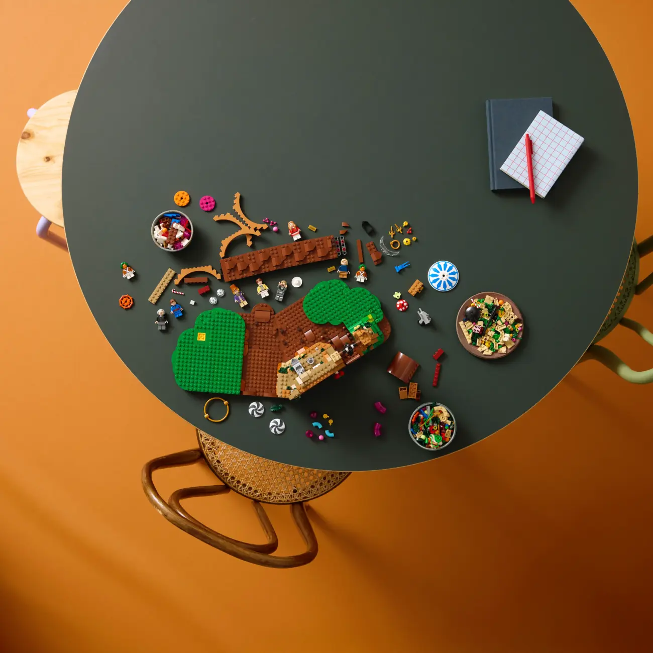 Mit neun Minifiguren, darunter Willy Wonka, Charlie Bucket, Opa Joe, Augustus Gloop, Mike Teavee, Veruca Salt, Violet Beauregarde und zwei Oompa Loompas, lädt das Set zum Nachbauen unvergesslicher Szenen aus dem beliebten Film ein. Die Figuren können in der farbenfrohen Landschaft der Fabrik in verschiedenen Posen aufgestellt werden.