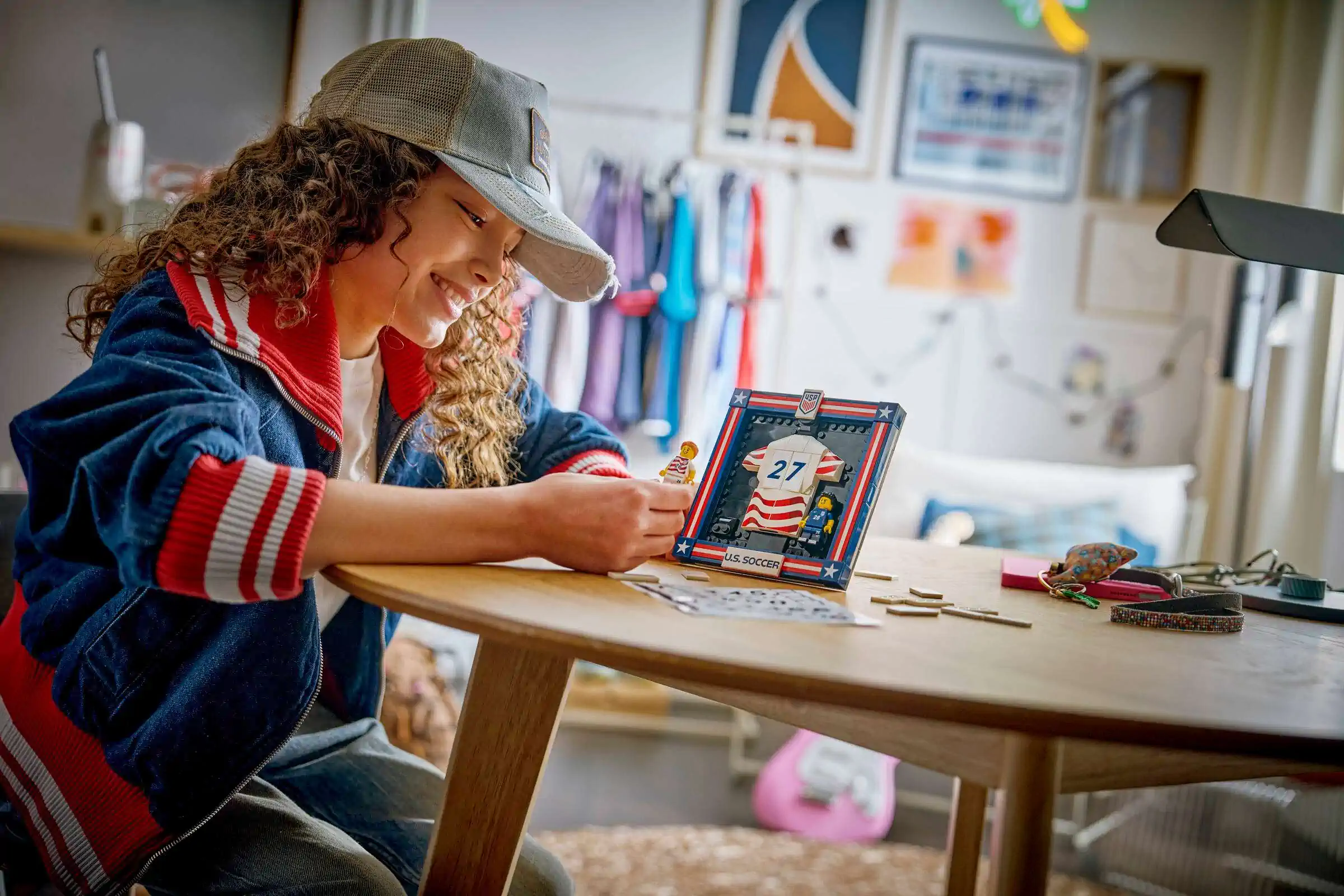 Das LEGO Editions Trikot der US-Fußballnationalmannschaft 2026 (43033) ist ein Bauset, das Kinder und Sportfans ab 10 Jahren kreativ werden und die US-Kicker anfeuern lässt. Kinder werden große Freude daran haben, diese gerahmte Version des Trikots des US-Fußballnationalteams zu erschaffen und all seine coolen Details zu entdecken. Das Set beinhaltet viele bedruckte Elemente und einen großen Bogen mit Nummern zum Aufkleben, um dem LEGO Fußballtrikot eine Rückennummer zwischen 0 und 99 zu verpassen. Eine der beiden LEGO Fußballer-Minifiguren trägt das „Stripes“-Outfit des Teams, die andere das „Stars“-Outfit. Kopf und Haare beider Minifiguren lassen sich anpassen. Fans werden den fertigen Hingucker gerne in ihrem Zimmer ausstellen. Das Set ist ein auch tolles Geburtstags- oder Weihnachtsgeschenk für Kinder und Fußballfans. Eine digitale Bauanleitung zu dem Set ist in der LEGO Builder App verfügbar. In der App können Kinder ein 3D-Modell drehen und sich anschauen, wie weit sie schon sind. Das Set besteht aus 167 Teilen.