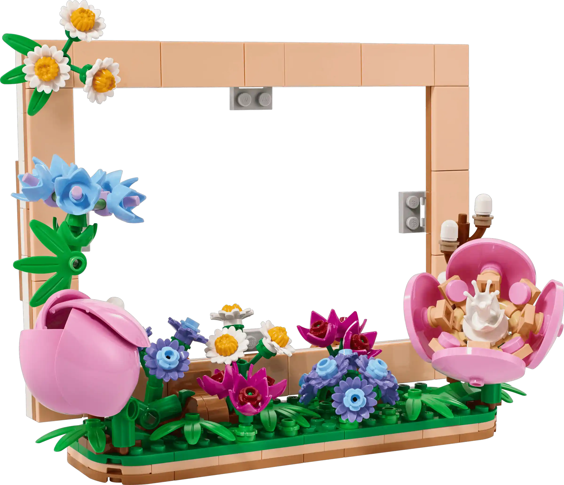 - LEGO BLUMEN: Der Bilderrahmen ist mit einem LEGO Gänseblümchen, einer Rose, Aschenkraut, Rittersporn, Weidenkätzchen und Kamelien verziert