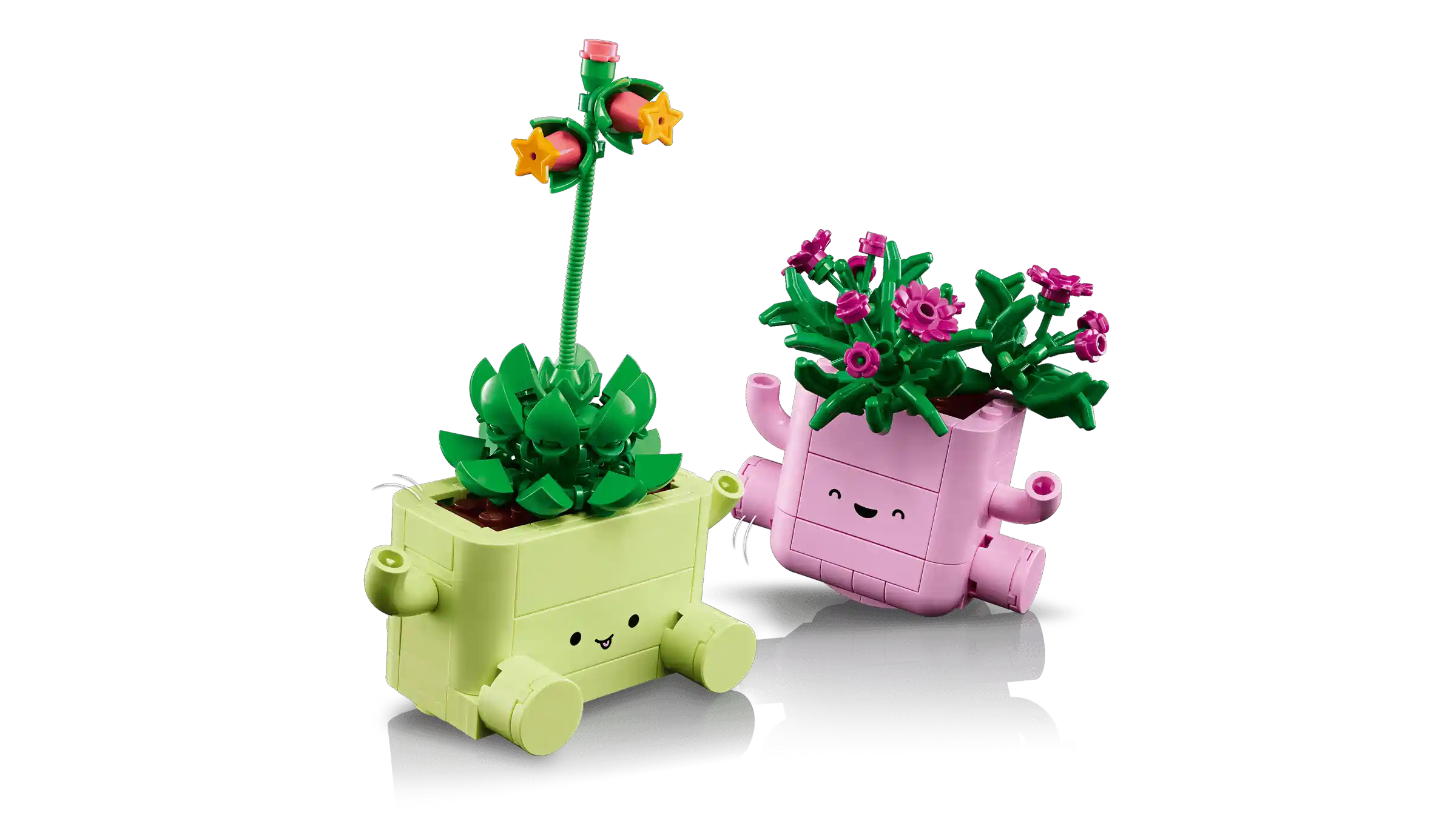 - 2 LEGO® PFLANZEN: Erschaffe eine Stauden-Mittagsblume (Delosperma) mit violetten Knospen namens Lumi, eine Echeveria mit langem Stiel und Korallenknospen namens Ellie und 2 Blumentöpfe mit Armen, Beinen und Smiley-Gesichtern