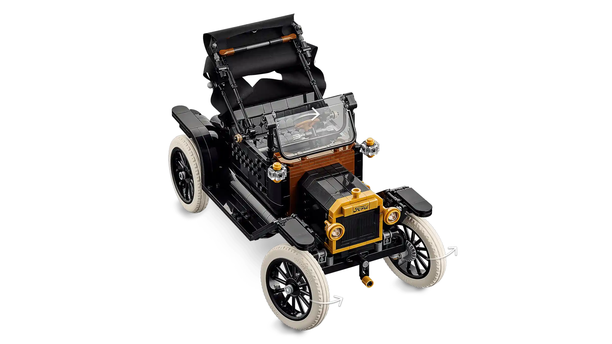 Feiere mit dem LEGO Icons Ford Model T (11376) aus diesem Bauset für Erwachsene eine echte Ikone der Automobilgeschichte. Diese authentische Nachbildung des Automobils aus den 1910er-Jahren hat ein Stofffaltdach, eine umlegbare Windschutzscheibe und eine aufklappbare Beifahrertür. Ein aufklappbarer Heckkofferraum und eine äußerst detailreiche Fahrerkabine mit funktionierender Lenkung sind weitere faszinierende Details. Heb den Sitz hoch, um Zugang zum Benzintank zu erhalten. Öffne beide Seitender Motorhaube, um den Motor zu bestaunen, und dreh die Kurbel, um das Gebläse rotieren zu lassen. Die schwarze Karosserie, die goldenen Akzente und die schmalen weißen Reifen auf den hohen Speichenfelgen machen dieses elegante Oldtimer-Modell zu einer imposanten Deko fürs Wohnzimmer oder Büro. Dieses Premium-Bauset ist ein tolles Geschenk für alle, die klassische amerikanische Autos lieben. Entdecke die inspirierenden separat erhältlichen LEGO Bausets, die speziell auf Erwachsene zugeschnitten sind. Die LEGO Builder App lässt dich noch smarter bauen. In der App kannst du der digitalen Bauanleitung folgen, ein 3D-Modell vergrößern und drehen und dir ansehen, wie weit du mit deinem Modell schon bist. Das Set besteht aus 1.060 Teilen.