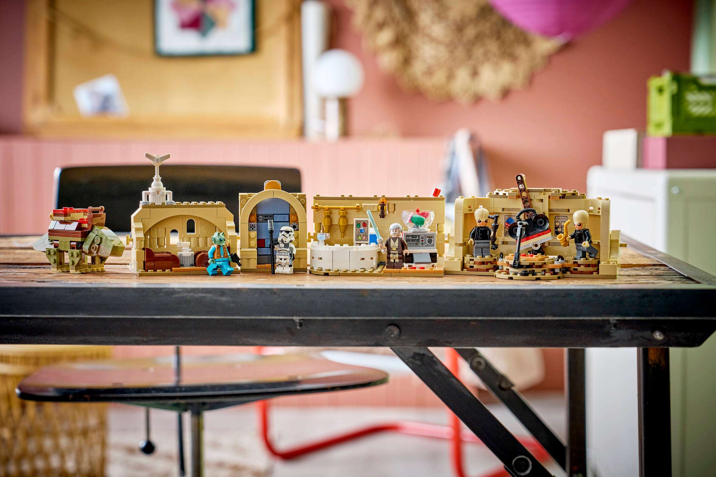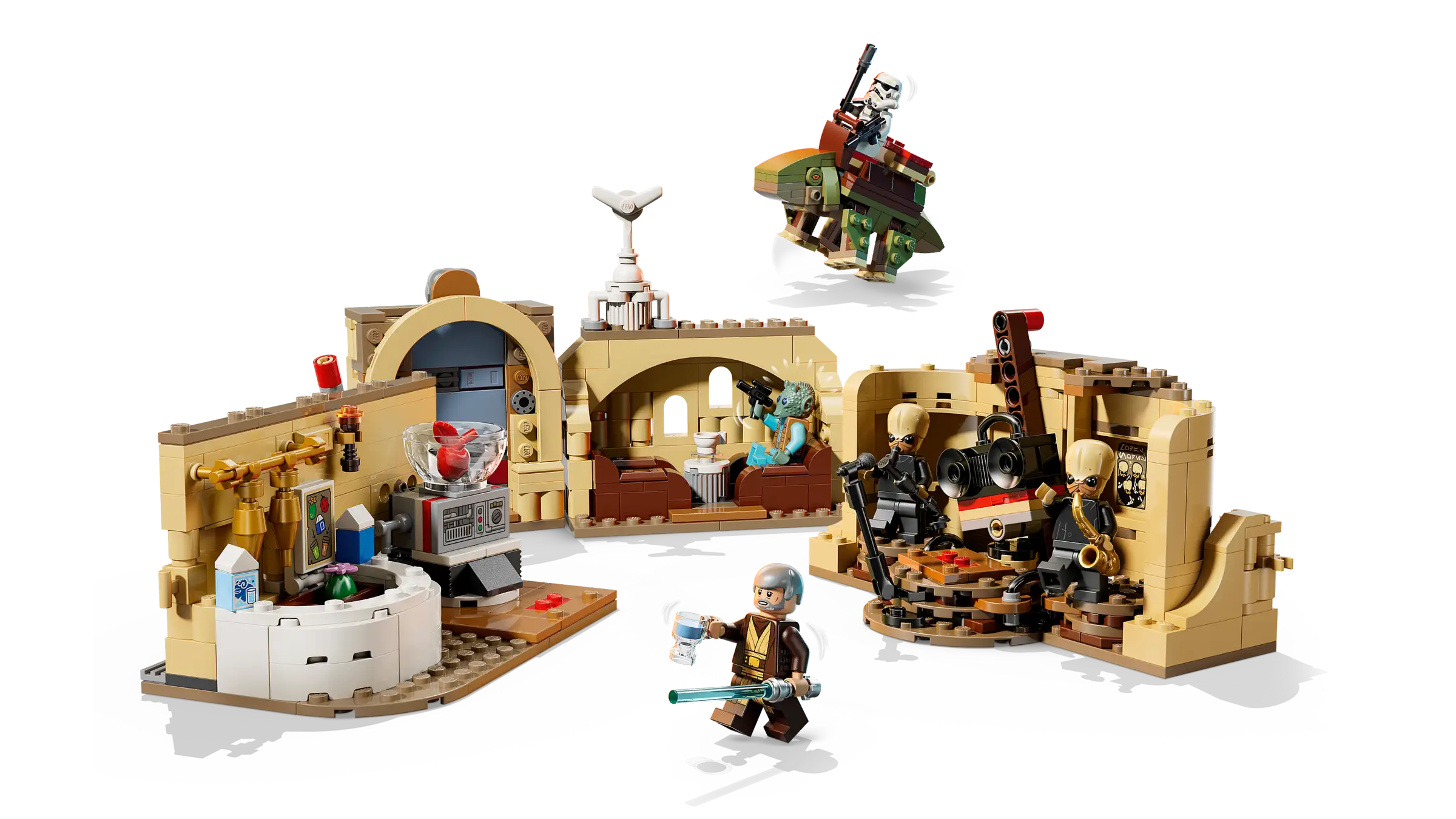 - DETAILREICHE MOS EISLEY CANTINA MIT VIELEN FUNKTIONEN: Katapultiere Minifiguren von den Schleudersitzsofas, mixe ein Getränk an der Bar, singe mit den Modal Nodes auf der Bühne Karaoke und reite mit dem Taurücken aus